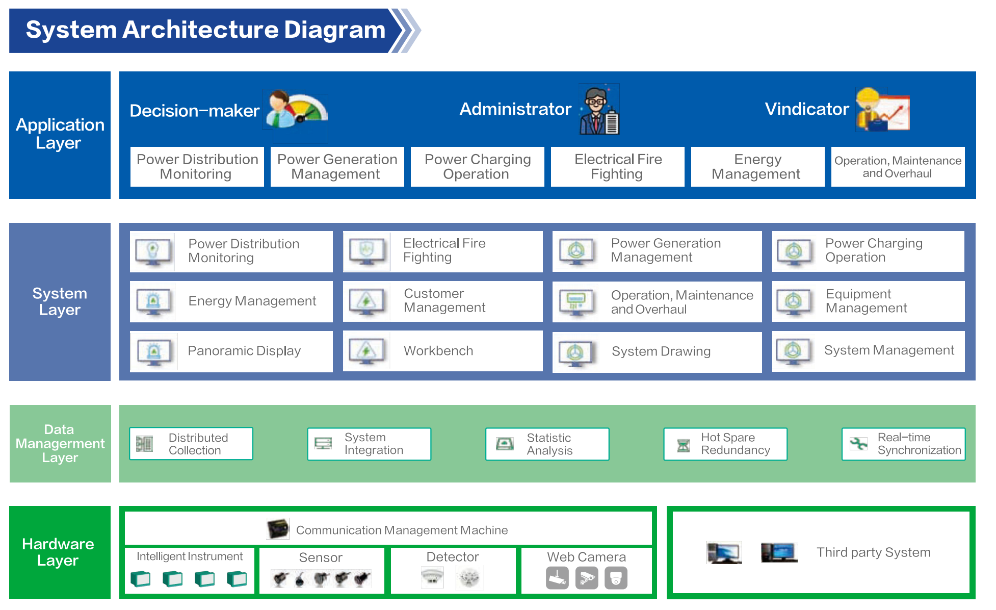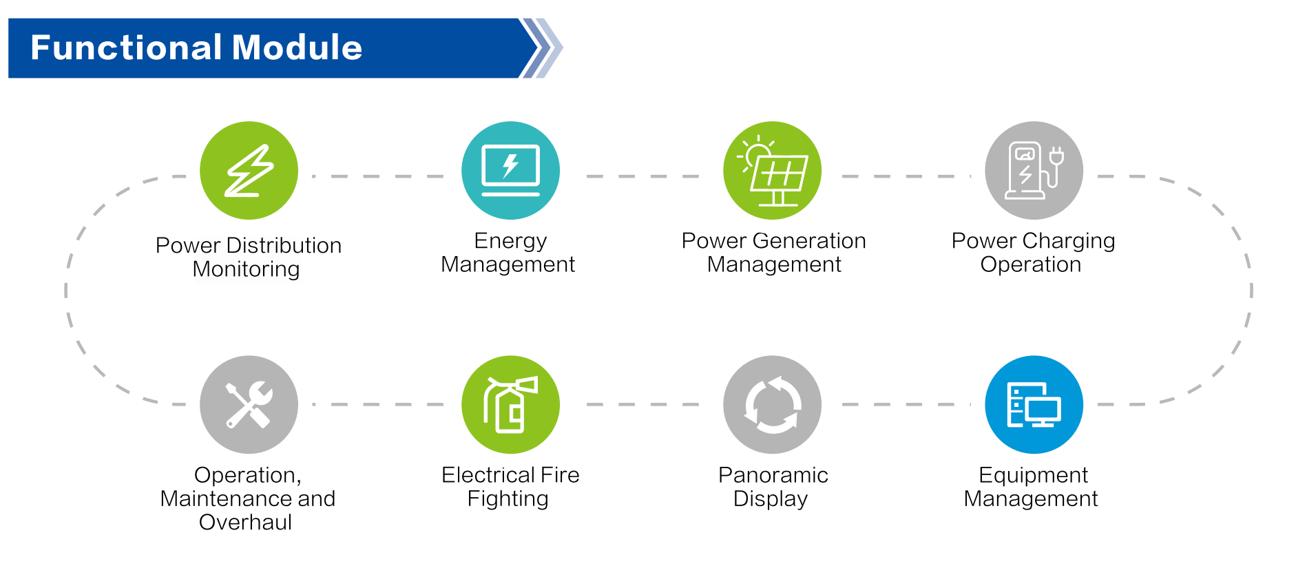 Electric power digital operation and monitoring platform applies the Internet of Things, big data, cloud computing, and remote operation and maintenance technologies to green intelligent buildings, and provides energy management, power distribution monitoring, power quality monitoring, leakage fire monitoring, fire equipment power supply monitoring, power generation management, charging cloud camping management, intelligent operation and maintenance and other functional applications through the collection, statistics, analysis, categorization, and processing of building energy data and information. It realizes the functions of fine management of energy consumption, energy consumption data mining and analysis, electricity safety monitoring, equipment operation monitoring and fault warning, etc. It comprehensively improves the energy utilization efficiency of intelligent buildings as well as the level of intelligence, and helps building owners to realize the standardization of building operation and management processes, and constitutes the control, management and maintenance of equipment, maintenance of the integrated technology system, to ensure the safety and stability of users’ electricity, reduce energy costs, labor costs and equipment maintenance costs, improve energy efficiency, to achieve the goal of safe, green and efficient use of energy, increase the value of the building in the whole life cycle, improve the brand image.